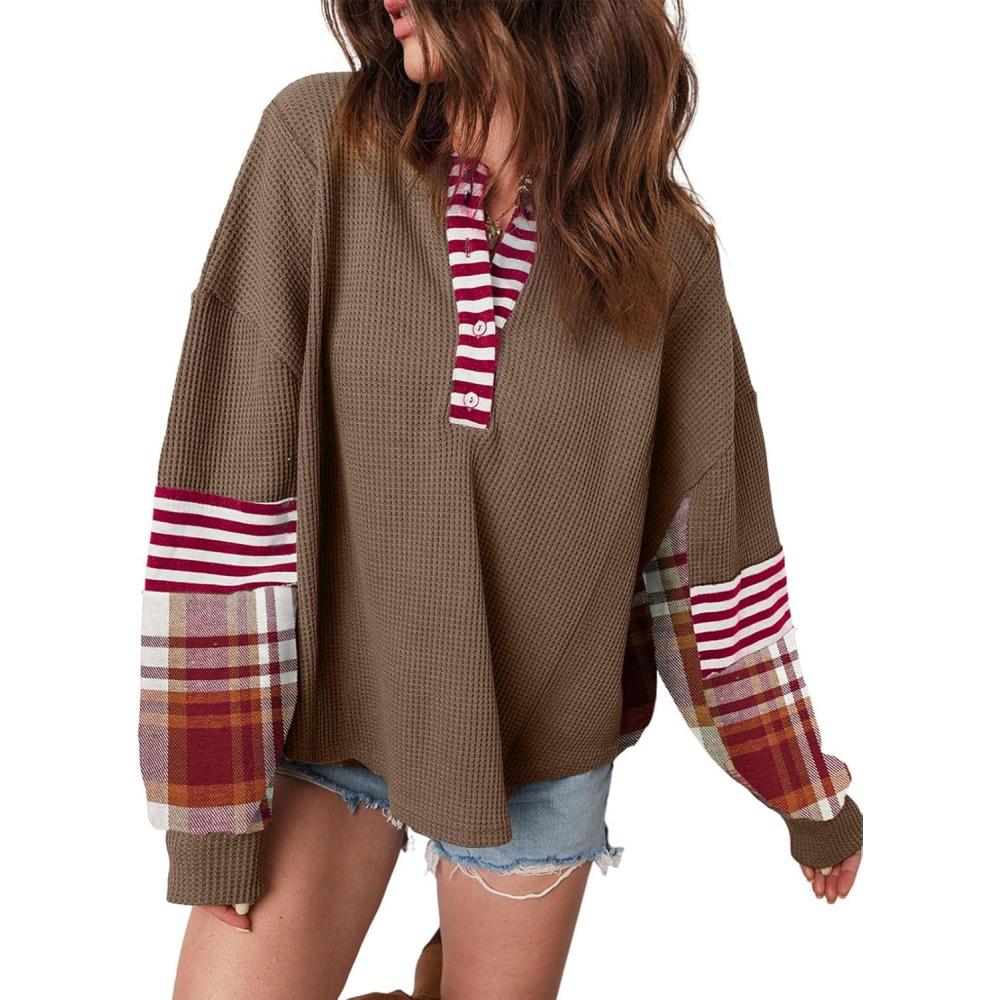 Acelitt Women Casual Color Block Long Sleeve V Neck Waffle Knit Shirts Tops,S-XXL(Brown)