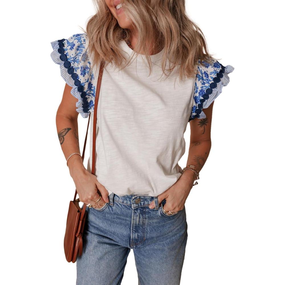 Acelitt Womens Summer Ruffle Short Sleeve Top Crewneck T Shirts Boho Floral Trim Casual Blouses(Sail Blue)
